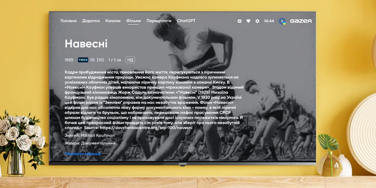 А щоб краще зрозуміти не простий характер такого жорсткого й швидкого, але, водночас, лагідного й привітного Києва пропонуємо вам коротку екскурсію в минуле. Подорож відбудеться без використання машини часу, лише за допомогою Gazer METASMART TV. Адже завдяки цьому ChatGPT-телевізору такі складні технології, як штучний інтелект, стали доступні кожному. А потрібну добірку було створено за запитом «фільми, в яких можна побачити Київ різних часів».