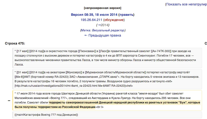 История внесения изменений в статью Википедии показала, что с ip-адреса ВГТРК была изменена формулировка о виновных в падении лайнера.