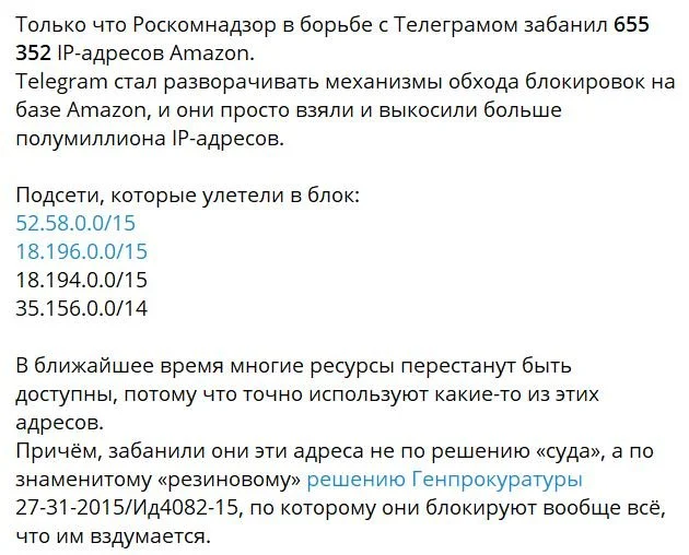Telegram почав використовувати сервіси Amazon для обходу блокування. Станом на 18.20 вечора, як пише канал "IT кримінальні справи СОРМ россіюшка", Роскомнадзор забанив 655 352 IP-адрес Amazon. Telegram використовував з них тільки кілька десятків.