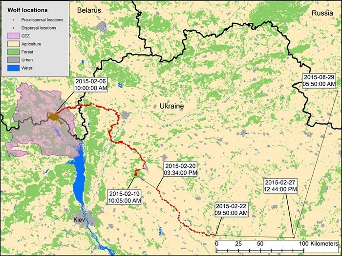 Дані про одно- або дворічного вовка були зібрані ще в лютому 2015 року з допомогою нашийника GPS, але дослідження, яке аналізує його переміщення, завершили недавно. Після прикріплення нашийника вчені відстежували вовка, який перемістився на велику відстань по Україні від Чорнобильської зони, причому тварина трималася лісів і районів, які використовуються для сільського господарства.