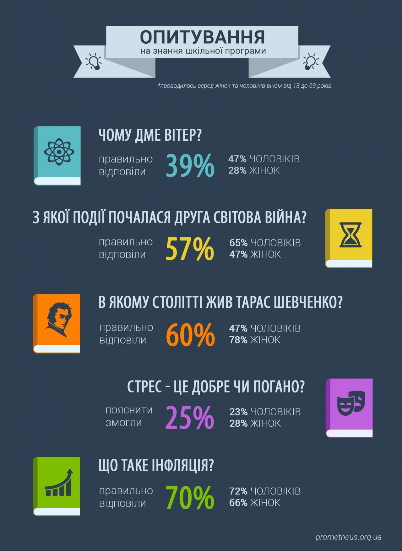 Виявилося, що менше 40% людей можуть відповісти на запитання "Чому дме вітер?", а 40% опитаних не змогли згадати, в якому столітті жив Тарас Шевченко. Лише 57% респондентів пам’ятають, з якої події почалася Друга світова війна. І тільки 25% опитаних змогли згадати про те, що стрес не лише негативно впливає на людину, але й виконує важливу позитивну функцію регуляції внутрішніх процесів в організмі.